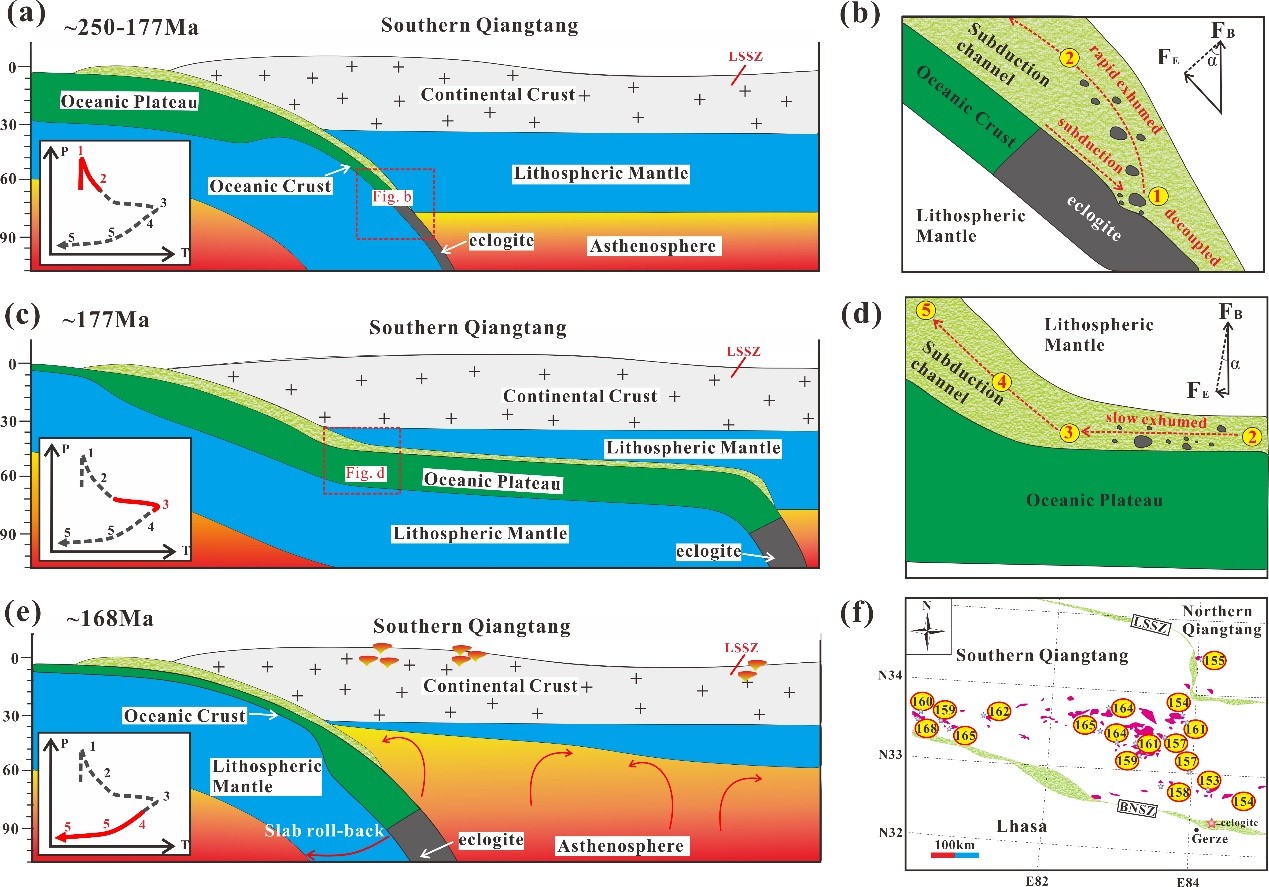 洞错退变榴辉岩是班公湖-怒江特提斯洋俯冲消减的产物。相平衡模拟及石榴石环带特征显示其经历了峰期榴辉岩相变质作用(T = 610–630 °C and P = 2.4–2.6 GPa),高压麻粒岩相变质作用的强烈叠加(T = 910–930°C and P = 1.2–1.3 GPa),以及晚期多期次的退变质作用。洞错榴辉岩具有一个复杂的顺时针P-T-t演化轨迹(图1),包括两段快速降压过程(M1–M2和M3–M4)和一段近等压加热的(M2–M3)的P-T演化轨迹,暗示其经历了两期快速折返和一期慢速折返的构造抬升过程。结合区域地质资料以及洞错榴辉岩的变质演化历史,提出班公湖-怒江洋中生代大洋高原的俯冲(250–177 Ma)导致了洞错榴辉岩从俯冲大洋板片的拆离以及随后的快速折返(M1-M2)(图2a,b)。随着巨厚且具有较大浮力的大洋高原被拉入俯冲带,俯冲板片角度逐渐变缓甚至形成平板俯冲,低缓的俯冲角度导致榴辉岩折返速率显著降低甚至滞留在深部地壳(~50 km)难以折返,后期的热松弛作用导致其遭受了177 Ma高压麻粒岩相变质作用的叠加(M3)(图2c,d)。随着俯冲大洋高原密度不断增加(榴辉岩化),俯冲角度由于板片的后撤(Roll-Back)(或者榴辉岩化大洋高原的拆沉)而增大,导致了洞错榴辉的第二期快速折返(M3-M4)、随后的角闪岩相退变质作用(~167 Ma),以及区域内同期(或稍晚)岩浆活动的爆发(图2e,f)。