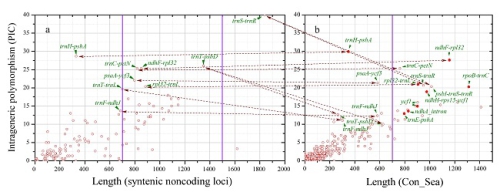 策略一命名为Con_Sea:基于多物种叶绿体基因组的联配结果,找出真正的保守区和变异区(Con_Sea),并开发新的叶绿体标记。结合生信分析及实验验证,我们发现基于Con_Sea区域开发的叶绿体新标记的多态性程度高于传统的基于非编码区开发的标记。