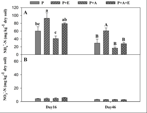 图2.微宇宙控制实验中不同处理下铵态氮(A)和硝态氮(B)的浓度。P仅栽种芒萁,P+E栽种芒萁并添加蚯蚓,P+A栽种芒萁并接种AMF,P+A+E栽种芒萁并同时接种蚯蚓和AMF