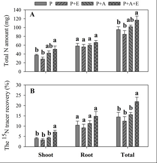 图3.微宇宙控制实验中不同处理下芒萁的总氮含量和15N标记物回收率