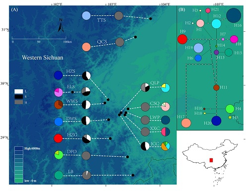 图2. 迎阳报春花型地理结构和谱系地理结构