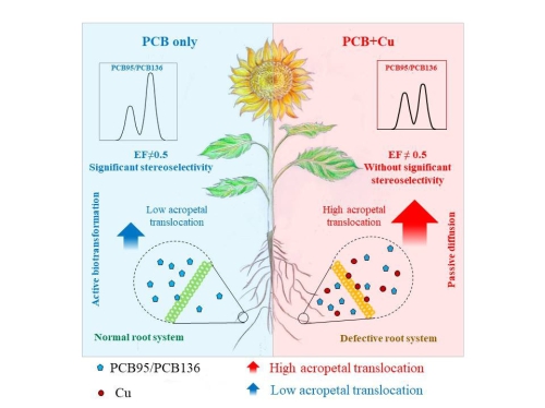 针对这一问题,中国科学院广州地球化学研究所有机地球化学国家重点实验室罗春玲研究员和博士后王少锐,以具手性异构的PCB95和PCB136为模型化合物,对其在Cu-PCBs复合污染下的植物吸收及转运机制,进行了实验研究。他们发现:在铜离子(Cu++)作用下,植物根系受损,根系细胞电解质渗漏率增加,PCB95(log Kow=6.13)和PCB136(log Kow=6.22)进入植物根系细胞,并往地上部迁移;而在无Cu++破坏根系的对照组,PCB95和PCB136主要吸附于根系表面,但均呈现出显著的手性分馏现象,表明正常植物根系细胞膜的选择透性,阻断了PCB95和PCB136向植物体内的转运,且PCBs在根系环境下发生了具手性选择性的生物作用。进一步的人为破坏植物根系实验,验证了PCB95和PCB136往地上部的迁移量,是随着根系细胞破坏程度的加大而增加的。因此,该利用手性PCBs示踪的研究证实,在Cu-PCBs复合污染土壤体系,由于Cu++导致植物根系破坏,植物对PCB95和PCB136的吸收转运,主要是以被动方式进行的,期间未发生明显的具显著手性选择性的生物转化作用。这一发现,为深入理解土壤复合污染机理及其植物效应,提供了新的视角。
