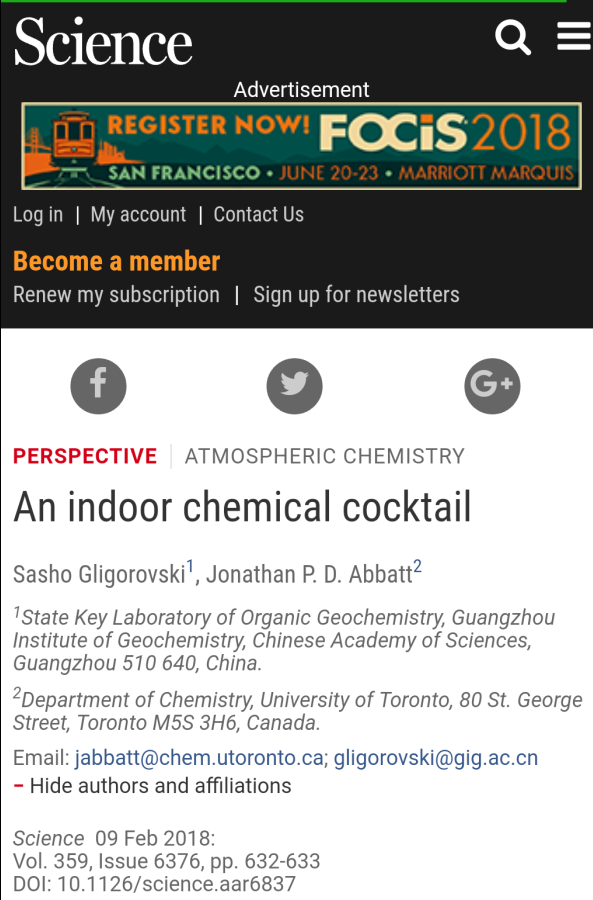近日,中国科学院广州地球化学研究所有机地球化学国家重点实验室Sasho Gligorovski研究员在Science的Perspective栏目发表题为”An indoor chemical cocktail”的文章,评述和讨论了室内空气污染的重要性、研究进展及发展方向。