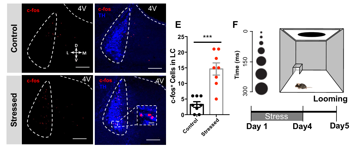 图1:压力激活脑干的蓝斑核团,并引起小鼠对视觉恐惧信号反应加剧。