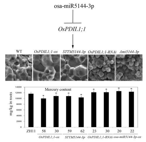 microRNA5144-3p调节水稻蛋白二硫键异构酶基因OsPDI1;1表达并影响种子发育及种子中汞累积示意图