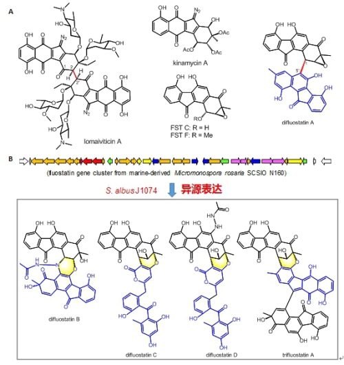 图1. 代表性非典型角环素类化合物(A)和fluostatin生物合成基因簇及其在S. albus J1074中异源表达的代表性产物(B)。