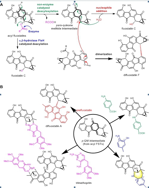 非典型角环素家族中,这些结构复杂的C?C或C?N偶联的二聚或三聚FSTs到底是如何形成的?据文献报道推测,该类二聚体可能是由NmrA家族调控蛋白酶FlsQ1催化形成。研究人员随后构建了flsQ1缺失突变株,但发现该突变株仍能生产difluostatin A。意外的是,研究人员经过反复多次观测发现,含有酰基的FSTs(acyl FSTs)可以在水溶液中经非酶催化的脱酰基反应自发形成C?C偶联的FST二聚体,如difluostatin F (图2A)。进一步深入研究发现:(1)acyl FSTs在非质子有机溶剂(如二甲基亚砜、丙酮和氯仿等)中表现稳定;(2)acyl FSTs在酸性条件下也表现稳定,但在碱性条件下很容易脱酰形成二聚体;(3)acyl FSTs在H218O中所形成的脱酰基产物和二聚体产物都标记上了18O。据此,研究人员推测了acyl FSTs自发脱酰和二聚化的两步反应机制(图2A):第一步反应是acyl FSTs通过非酶催化脱酰氧基形成一个对醌酮甲基化物(para-quinone methide,
