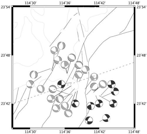 图2. 新丰江地区地震震源机制解,图中灰色震源球为正断型,黑色为走滑型。浅灰线为水库边界。