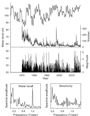3.为了进一步认识水库蓄水对地震活动的影响,研究团队对新丰江水库1970年以来的水位变化和地震活动的相关性进行了分析(图3)。结果表明:1)水库地震的深度逐年加深,表明水库下方的断层/裂隙不断向深部延伸,很有可能是在水的渗透作用下岩石破裂造成。2)水位变化存在明显的两个周期变化,时间跨度分别为1年和5年。然而地震活动只有一个时间跨度为5年的周期,这表明新丰江水库大周期和大水位变化(时间跨度约5年,水位变化约20米)对地震活动的影响更大。