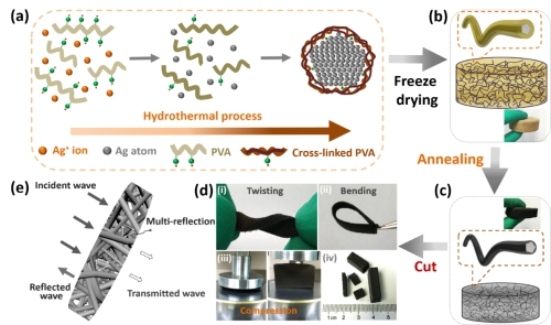 图1 高性能电磁屏蔽碳包覆银纳米线杂化海绵的制备:(a)Ag@C的制备示意图;(b)碳化前与(c)碳化后杂化海绵示意图及实物图;(d)不同形状的杂化海绵,表现出优异的力学性能;(e)杂化海绵屏蔽电磁波原理示意图。