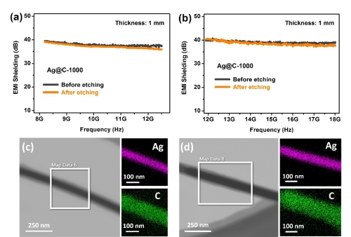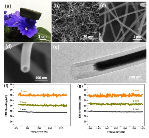 近日,香港中文大学廖维新教授,中国科学院深圳先进技术研究院汪正平院士、孙蓉研究员团队在国际纳米材料领域权威期刊Small上发表了最新研究成果“Anticorrosive, ultra-light and flexible carbon-wrapped metallic nanowire hybrid sponges for highly efficient electromagnetic interference shielding”(《用于高性能电磁屏蔽的耐腐蚀轻质柔性碳包覆金属纳米线杂化泡棉》)。科研人员采用水热法和高温退火制备了碳包覆银纳米线杂化海绵(Ag@C),该Ag@C海绵具有超轻(极低的密度3.2 mg/cm3)、良好的力学性能(可弯折、扭曲,以及在90%压缩应变下完全回复)和优异的电磁波屏蔽性能(在X-band和Ku-band高于70 dB)。更为重要的是,由于壳层碳对银线的有效包覆及其特殊的多孔结构,Ag@C海绵表现出超疏水(水接触角158o)和优异的耐腐蚀性能(在pH=0的硝酸溶液下浸泡7天屏蔽性能无明显变化)。该杂化海绵结合了金属优异的屏蔽性能和碳材料的轻质、柔性和耐腐蚀等优点,综合性能远优于传统金属材料和普通碳材料。该工作为开发高效、轻质、柔性、耐腐蚀金属基电磁屏蔽材料提供了新的设计思路。香港中文大学博士生万艳君为论文第一作者,廖维新教授、孙蓉研究员为论文的共同通讯作者,团队成员朱朋莉研究员和于淑会研究员参与了该项研究工作。