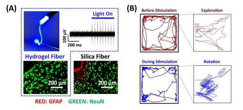 为了解决上述问题,研究团队合成了具有高导光性的海藻酸钠-聚丙烯酰胺水凝胶材料,并且在此基础上制备出了直径为100-600微米的水凝胶光纤。制备的水凝胶光纤具有优异的光学和力学性能,在空气中测得的光传导损失率仅为0.25dB/cm,杨氏模量与神经组织接近(约60kPa),并且能反复拉伸至初始长度的400%以上。借助这种水凝胶光纤,可以稳定地诱发出神经元的特异性相应,并实现对动物行为的控制。此外,与传统的石英光纤相比,这种水凝胶光纤具有更佳的组织相容性。并且在经过长期的体内埋植后,水凝胶光纤仍能基本保持原有的光学和力学性能。得益于上述特性,团队研发的水凝胶光纤将为光遗传技术在脊髓和周边神经的应用乃至未来的临床化发展提供重要的技术支持。