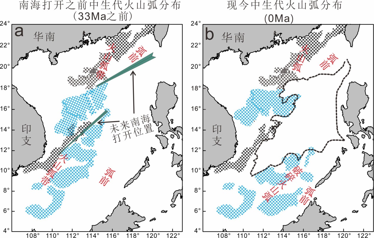 为揭示南海主被动陆缘转换机制和海盆打开东早西晚的穿时破裂特征,科学家们利用等效源深度法对全南海区域的磁力异常数据进行化极异常处理,通过延拓和功率谱计算出磁源的位置和深度;收集并对比了南海海域超过200口钻井和拖网的岩相与地球化学数据,重建了中生代岛弧和弧前盆地体系,结合地震剖面等资料追踪中生代的变形和沉积特征,在此基础上重建了南海陆源中生代的山-弧-盆体系。研究显示新恢复的火山弧与华南-越南陆上中生代弧后花岗岩带延伸范围一致,较好的约束了中生代俯冲带的范围。研究发现现今火山弧在南海东北部较为完整,而在西南部则零散分布在西南次海盆两侧,揭示了新生代南海陆缘的破裂不仅具有穿时特征,还具有空间上的差异,南海东北部破裂作用发生在弧前,而西南部破裂则发生在火山弧上。这种穿时空破裂特征对于认识南海东西部陆缘结构、沉积演化以及资源上的东西差异具有重要意义。