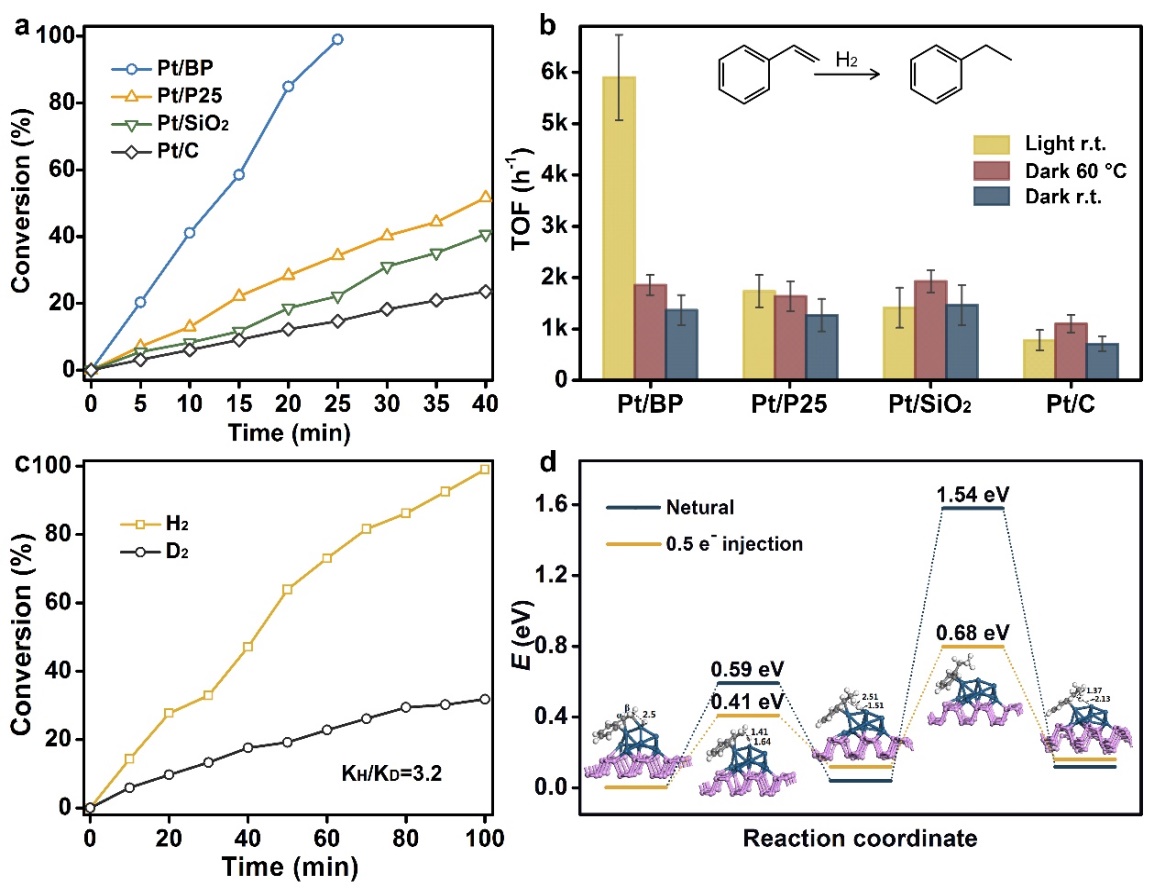 图2. (a) 不同催化剂光催化苯乙烯加氢性能转化率对比;(b) 黑磷/铂光催化和热驱动苯乙烯加氢性能转化率对比;(c) 黑磷/铂在苯乙烯加氢中观察到的主要同位素效应; (d) 光电子对苯乙烯加氢能垒变化影响。