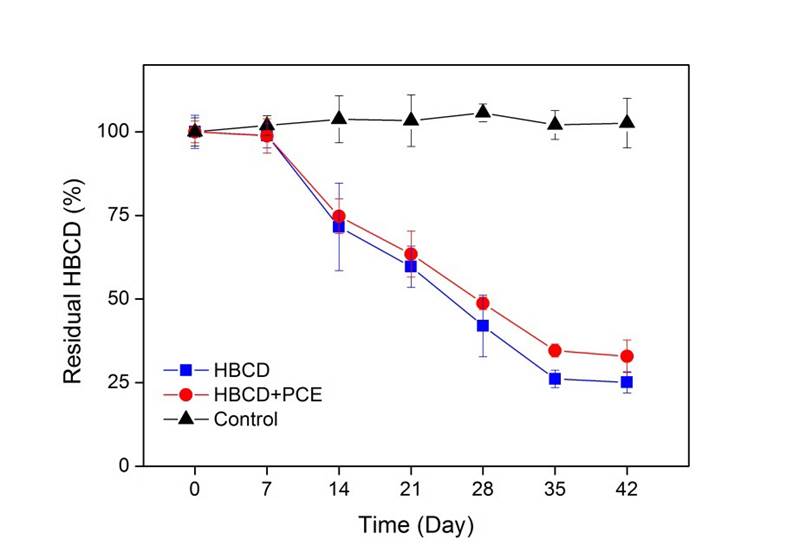 近期,中国科学院院广州地球化学研究所彭平安研究员、钟音副研究员和美国罗格斯大学Lily Young教授、黄伟林教授合作开展了HBCD厌氧微生物降解研究。研究发现在厌氧环境中广泛存在的氯呼吸菌Dehalococcoides mccartyi能利用HBCD为唯一电子受体对HBCD进行还原脱溴(图1)。经过42天的实验,12 μM HBCD的还原脱溴率达到了75%,生成三种脱溴产物,分别为四溴环十二烷碳一烯、二溴环十二碳二烯和环十二碳三烯。HBCD的厌氧微生物降解具有非对映体选择性,三种异构体的降解速率依次为α-HBCD > β-HBCD > γ-HBCD(图2)。然而,HBCD的对映体降解不具有选择性。此外,其它生长基质(如四氯乙烯)的添加对HBCD的降解效率、对映体和非对映异构体的降解选择性均无显著影响。