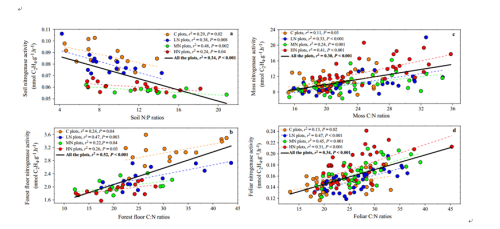 自由固氮是森林生态系统重要的氮素来源之一,并且许多研究认为自由固氮在高纬度地区森林(多数为土壤氮限制)发挥主要作用。传统理论和研究证据均表明,生物固氮是一个典型的耗能反应,所以在土壤氮富集和外源氮输入的背景下,固氮植物和微生物不具有竞争优势,其固氮活性会受到抑制。