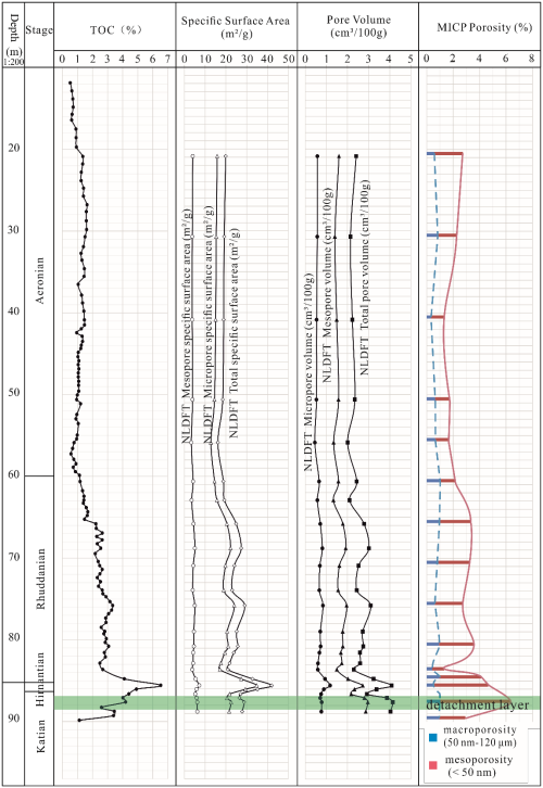 纵向上,页岩的孔隙度、比表面积以及纳米孔体积的变化趋势与TOC的变化趋势高度相关,更高的TOC值通常意味着更高的孔隙度和比表面积(图1)。此外,因为经历了多期构造运动,导致五峰组中普遍发育的滑脱层。与正常地层页岩的孔隙度、纳米孔分布和扫描电镜图像对比研究结果表明,页岩滑脱层是又一个能影响五峰-龙马溪组页岩物性特征以及页岩气资源潜力的重要因素。首先,多期构造运动产生的裂缝和微裂缝能致使滑脱层页岩的介孔和宏孔显著增大。其次,滑脱层中的微裂缝能够连通更多的孔隙,从而提高页岩的连通性,也为页岩气在区域上水平运移提供了通道,从而使得页岩气的保存条件也变得重要。在整个四川盆地及其周边地区,五峰-龙马溪组页岩底部广泛出现的滑脱层使得保存条件成为一个能影响最终页岩气潜力的重要因素。与涪陵页岩气田Jiaoye1井的五峰-龙马溪组页岩相比,三泉镇Sanquan-1井具有大体相当的生烃潜力;由于该地区的背斜圈闭遭到剥蚀、破坏,此外滑脱层加速了页岩气从页岩基质中散失,从而导致三泉镇页岩气资源潜力非常有限。