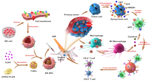 继手术、化疗和放疗后,免疫疗法已成为癌症治疗的一种主要治疗方式。它不仅能够高效、安全地根除原位肿瘤,而且能通过激活机体免疫系统来识别和清除残留的肿瘤细胞,防止肿瘤转移和复发。我们开发了一种细胞膜免疫治疗策略,它能够通过NK细胞膜伪装纳米颗粒(NK-NPs)来消除原发性肿瘤并抑制远处肿瘤生长。通过蛋白质组学方法分析NK细胞膜的蛋白质组分和功能,我们发现NK细胞膜的存在使NK-NPs具有肿瘤靶向性,并且诱导巨噬细胞向M1型极化以产生抗肿瘤免疫。同时NK-NPs中的光敏剂TCPP可通过光动力疗法诱导肿瘤细胞发生免疫诱导死亡以产生损伤相关分子,从而增强NK细胞膜肿瘤免疫治疗效率。这种细胞膜免疫治疗法为肿瘤免疫疗提供了新的方法和策略。