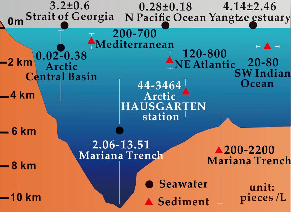 马里亚纳海沟挑战者深渊与世界其它海域微塑料含量对比