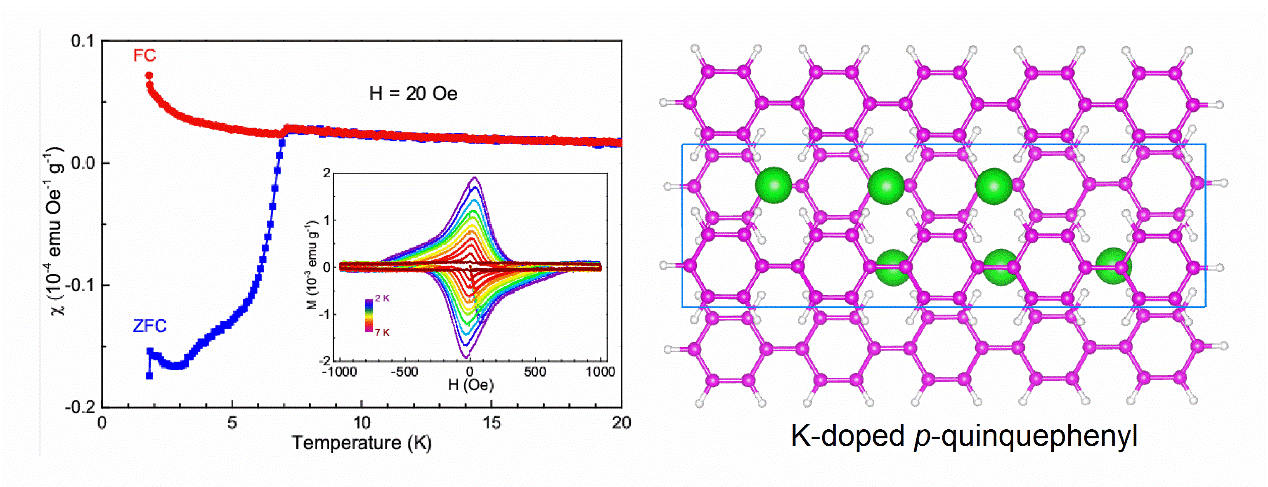 图.(左)钾金属掺杂五联苯体系的磁化率-温度曲线,超导转变发生在7 K左右;(右)超导相的微观原子结构。