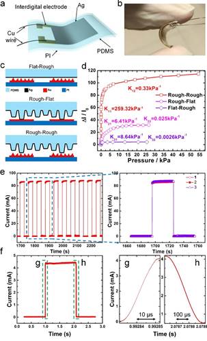 图1. 微结构压力传感器传感特性:(a-b)制备的压力传感器具备良好的机械柔韧性 (c-d)不同微结构的压力传感器传感特性,其中“粗糙-粗糙”型传感器具备超高的灵敏度及最宽的动态范围(e)“粗糙-粗糙”型压力传感器具备良好的稳定性(f)“粗糙-粗糙”型压力传感器的响应和恢复时间。
