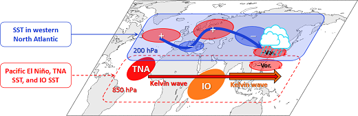 -Vor.: 相对涡度负异常; 蓝色箭头: 经过欧洲到达亚洲的大气波列活动; IO: 印度洋; TNA: 热带北大西洋. 西北大西洋引起中纬度北大西洋位势高度正异常, 通过横跨欧亚大陆的波列活动影响华北涡度, 而印度洋海温和热带北大西洋海温(前一年冬季太平洋的El Ni?o事件的电容器)与南海涡度的变化有关. 华北涡度和南海涡度联合造成了长江流域的强降水. 三个大洋均对2020年6月长江流域的降水有贡献, 但是大西洋起主导作用.