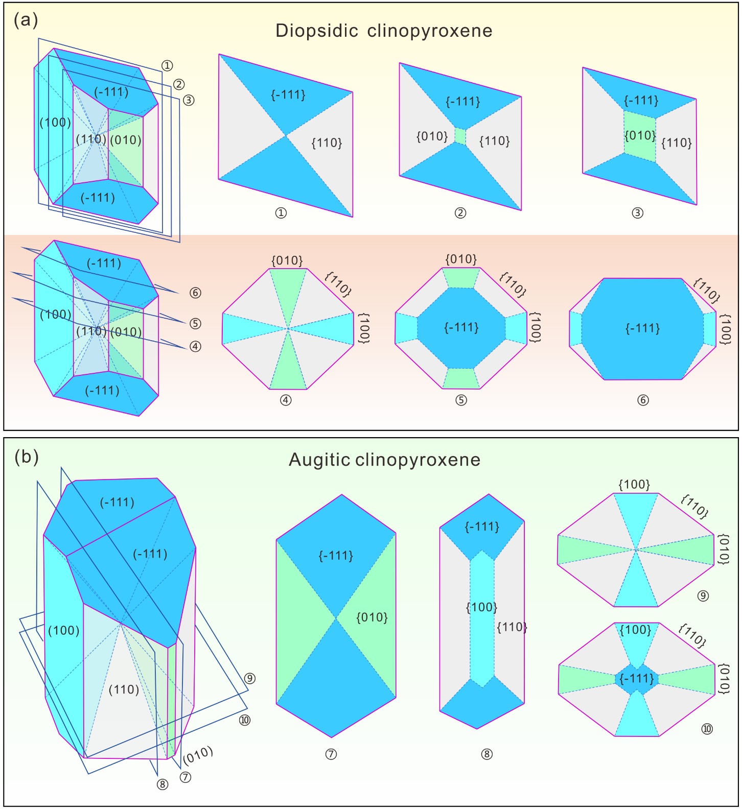 针对这一科学问题,中国科学院广州地球化学研究所、深地科学卓越创新中心岩石学学科组博士后周金胜、王强研究员及其合作者对青藏高原南部赛利普钾质超钾质火山岩中的单斜辉石,进行了系统的研究。首先在晶体模型的基础上(图1),通过详细的结构研究,限定了矿物的结晶学方向和生长规律,包括沿着c轴的沙漏扇{-111}和平行于c轴的棱柱扇{100}、{110}和{010}扇,即{hk0}扇。然后对不同结构的晶体和晶体中不同结晶方向进行了系统的定量分析以及元素面扫描(图2和图3),查明了晶体结构和结晶方向对元素分布的控制规律,相对于{hk0}扇,大部分的{-111}扇是富集Si、Mg但亏损Ti、Al、Na和Cr,但也同时存在富含Al的{-111}扇。大部分的{-111}扇具有更低的结晶温度、压力和水含量,但也存在反向规律的晶体。