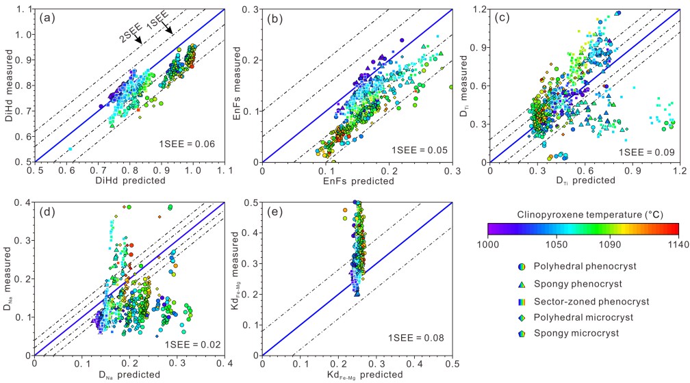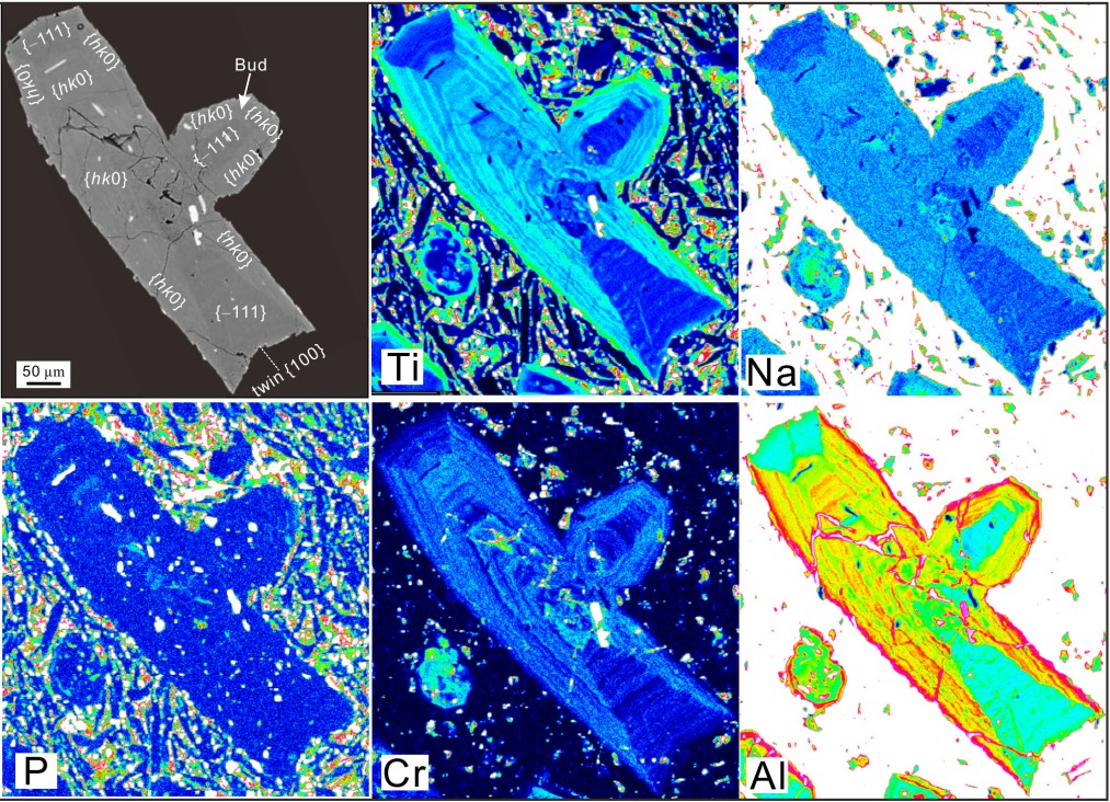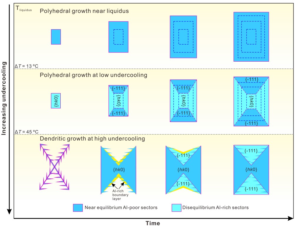 基于以上分析,并结合实验岩石学资料,该研究提出一种新的综合的矿物生长模型,即:岩浆中单斜辉石的生长过程取决于过冷度,在非常低的过冷度下,也就是近液相线条件,矿物呈现传统的树木年轮式生长,不同晶面成分相似;低过冷度下,单斜辉石所有晶面同步生长,但不同晶面会呈现成分差异,形成近平衡的富Si-Mg的{-111}扇和不平衡的富Al-Ti的{hk0}扇;在高过冷度下,单斜辉石首先形成树枝状的格架,再快速回填形成近平衡的漏斗状{hk0}扇,漏斗状晶体港湾中,由于存在富Al的扩散边界层,因而最终通过回填形成不平衡的富Al的{-111}扇。这一新的晶体生长模型得到了国际同行的高度评价,例如意大利罗马大学著名实验岩石学家Silvio Mollo教授认为这项工作是:“Undoubtedly, these new data and their interpretation will be greatly appreciated by our petrological community. I congratulate the authors for the great job done.”。