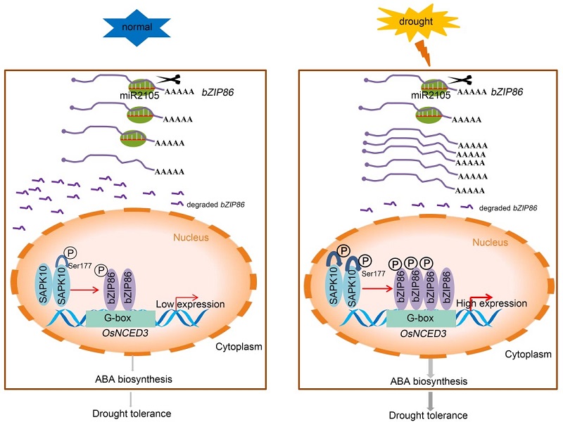 中科院华南植物园农业与生物技术研究中心博士生高维维等,研究发现干旱时水稻miR2105直接靶向切割OsbZIP86 mRNA来调控OsbZIP86转录本水平,影响水稻的耐旱能力,超表达OsbZIP86或降低miR2105表达可提高水稻的耐旱性。OsbZIP86和miR2105在干旱胁迫条件下分别促进和抑制ABA合成关键限速酶基因OsNCED3转录,并且OsbZIP86可直接与OsNCED3启动子结合并激活其表达,从而通过调节水稻体内ABA的生物合成来提高水稻耐旱性。但是,miR2105和OsbZIP86转基因水稻只在干旱条件下影响体内ABA的生物合成,正常条件下不影响水稻的农艺性状。进一步研究发现SnRK2蛋白激酶能在干旱条件下促进OsbZIP86的磷酸化并激活OsbZIP86活性,从而增强其对OsNCED3的转录激活作用。因此,该研究阐释了miR2105-(OsSAPK10)-OsbZIP86-OsNCED3分子模块参与水稻干旱胁迫应答的分子机理,并提出miR2105和OsbZIP86可能具有能提高水稻抗旱性,但不影响正常生长条件下水稻农艺性状的潜能,可为后续水稻抗旱遗传改良提供新思路。