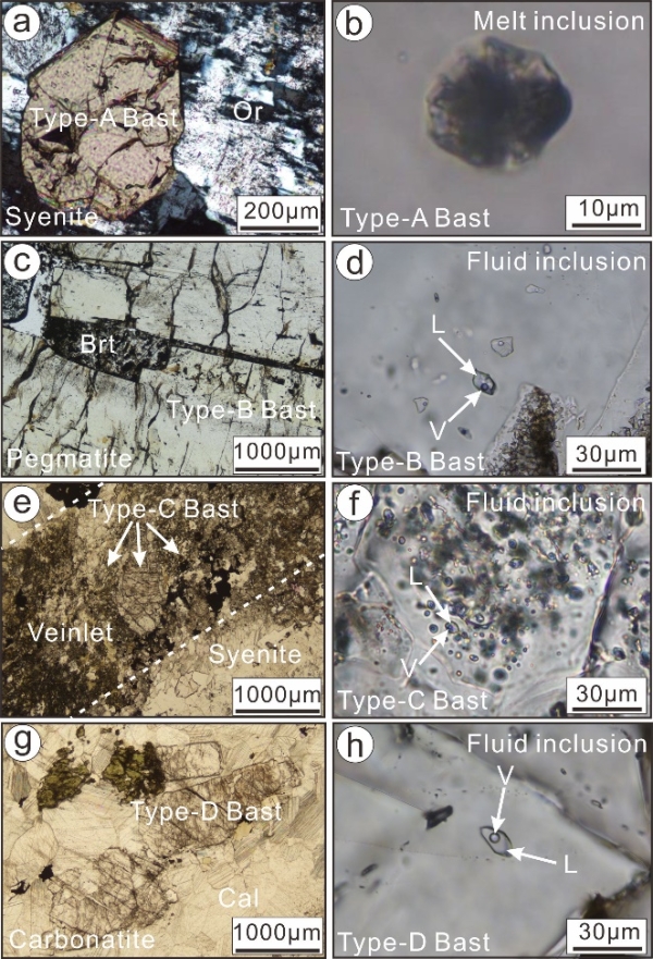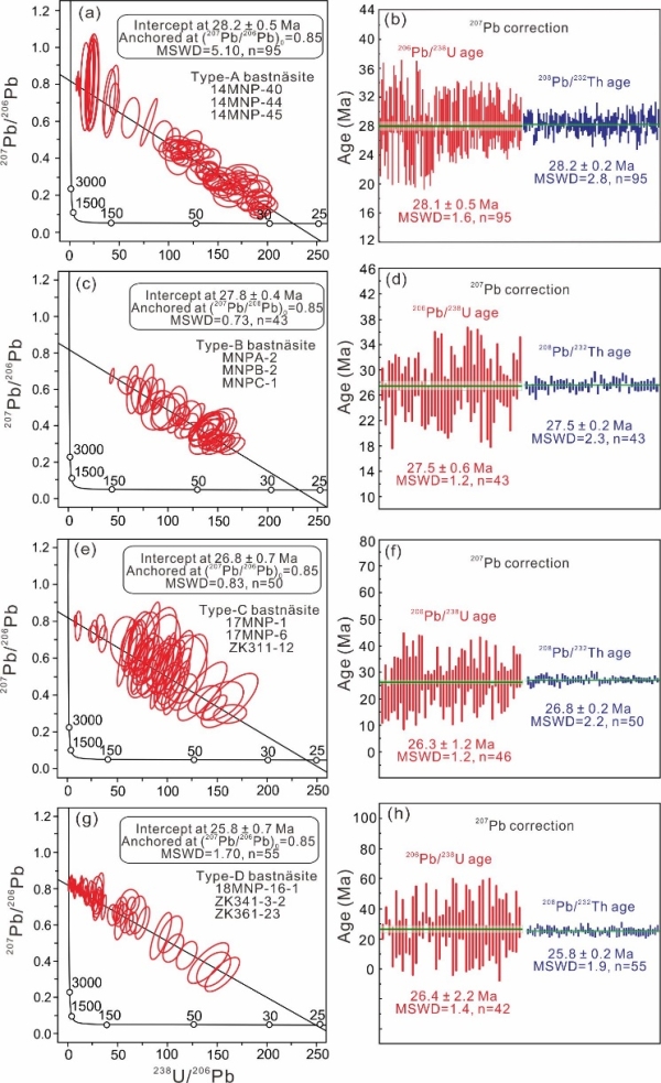 (1)牦牛坪矿床存在四种类型的氟碳铈矿,分别是碱性正长岩中的岩浆氟碳铈矿(Type-A Bast)、霓辉重晶伟晶岩脉(Type-B Bast)、碱性正长岩热液脉(Type-C Bast)和碳酸岩脉(Type-D Bast)中的热液氟碳铈矿(图1)。LA-ICPMS氟碳铈矿U(Th)-Pb定年结果(图2)显示,牦牛坪矿床整个碱性岩-碳酸岩杂岩体的演化时长高达2.5 百万年,其中碱性正长质岩浆演化时长接近1.5 百万年,霓辉重晶伟晶盐熔体和碳酸盐熔体的岩浆演化时长接近2 百万年。这表明,牦牛坪矿床中稀土超常富集和成矿与碱性-碳酸岩浆经历过长时间充分的分异演化有密切的关系。