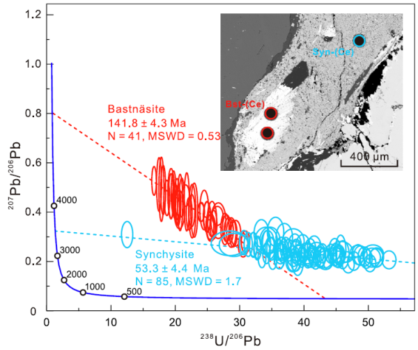 扬子克拉通西缘的牦牛坪超大型稀土矿床和华北克拉通西缘的干沙鄂博稀土矿床是典型的碱性岩-碳酸岩型稀土矿床,它们均以氟碳铈矿为主要的经济矿物。中国科学院广州地球化学研究所牛贺才研究员团队博士生翁强和李澳,通过利用氟碳铈矿矿物探针的方法,对牦牛坪和干沙鄂博稀土矿床中的氟碳铈矿开展了精细原位U(Th)-Pb定年和地球化学研究。主要获得以下认识: