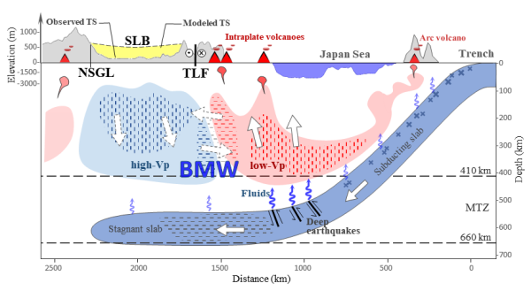 西太平洋板块沿日本-伊豆-小笠原-马里亚纳海沟西向东亚大陆俯冲,并滞留在地幔过渡带的下部,滞留板片之上的地幔被称为大地幔楔(BMW)。东亚大地幔楔自白垩纪以来对东亚的板内火山,深源地震,克拉通破坏,乃至东亚大陆边缘的演化产生了深远影响,但是对大地幔楔动力学模式的认识还不足。