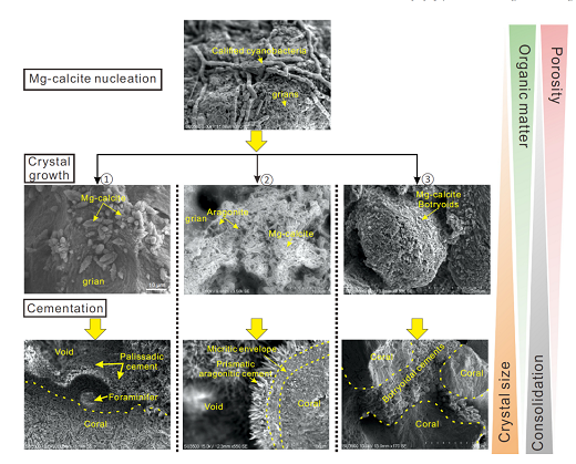 研究人员在西沙群岛全富岛海滩岩中发现大量具有钙化胶鞘的蓝细菌Lyngbya(鞘丝藻属),Calothrix(眉藻属)和Dichothrix(双须藻属)活体细胞。菌丝胶鞘由微米级高镁方解石有机矿物组成,晶型涵盖从无定型到短棒状和片状;蓝细菌的光合作用是诱导碳酸钙沉淀的主要机制,光合作用引起周围孔隙水碱度升高,碳酸钙矿物过饱和,继而在胞外聚合物(Extracellular Polymeric Substances,EPS)上结晶;蓝细菌死后,碳酸钙雏晶随着细胞有机质的分解散落粒间孔隙,晶体在有机和无机作用下快速生长,最终胶结海滩颗粒物。