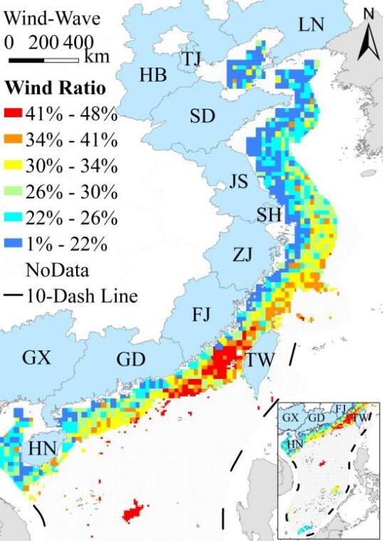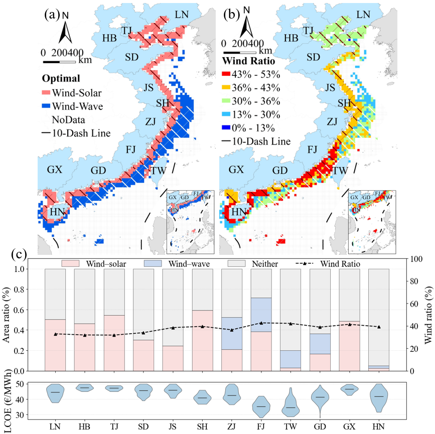 研究表明,总体来看,以风电为基础的互补系统是未来海上多能互补开发的关键方向。其中,风光互补总体上最具经济性,适宜在近海优先布局;风波互补则在南部深水、远海海域展现出较大发展潜力(图5)。该研究有助于推动海上可再生能源从“证明存在互补性”走向“支撑空间规划与开发决策”,也为波浪能通过多能互补路径实现更高效、更经济开发提供了新思路,并为其他海域开展类似研究提供了可迁移的方法框架。