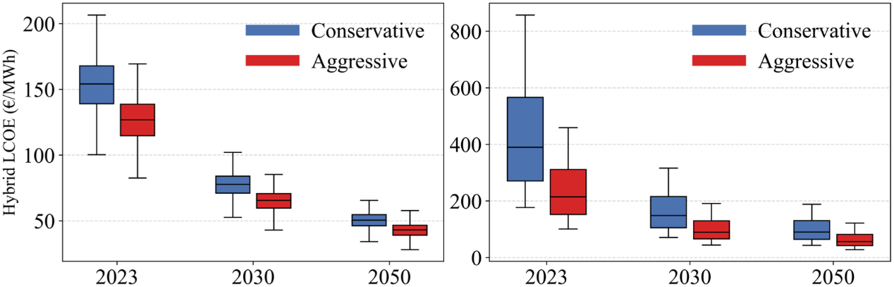 在技术经济性方面,研究对2025、2030和2050年不同成本情景下的互补方案平准化度电成本进行了评估。结果显示,两类互补的LCOE均随时间显著下降,但风光互补始终具有更优的经济性。风光互补在2025年的LCOE中位数约为127-155 €/MWh,到2050年可下降至43-51 €/MWh。风波互补虽然降幅更大,但绝对成本仍明显高于风光互补,但在技术进步情景下其竞争力有望明显提升,部分海域成本同样可降至50 €/MWh以下(图4)。此外,相对于“海上风电+储能”参考方案,风光互补在大部分适宜海域可显著降低平滑相关成本(约为-83%),而风波互补的成本优势主要集中在特定海域。