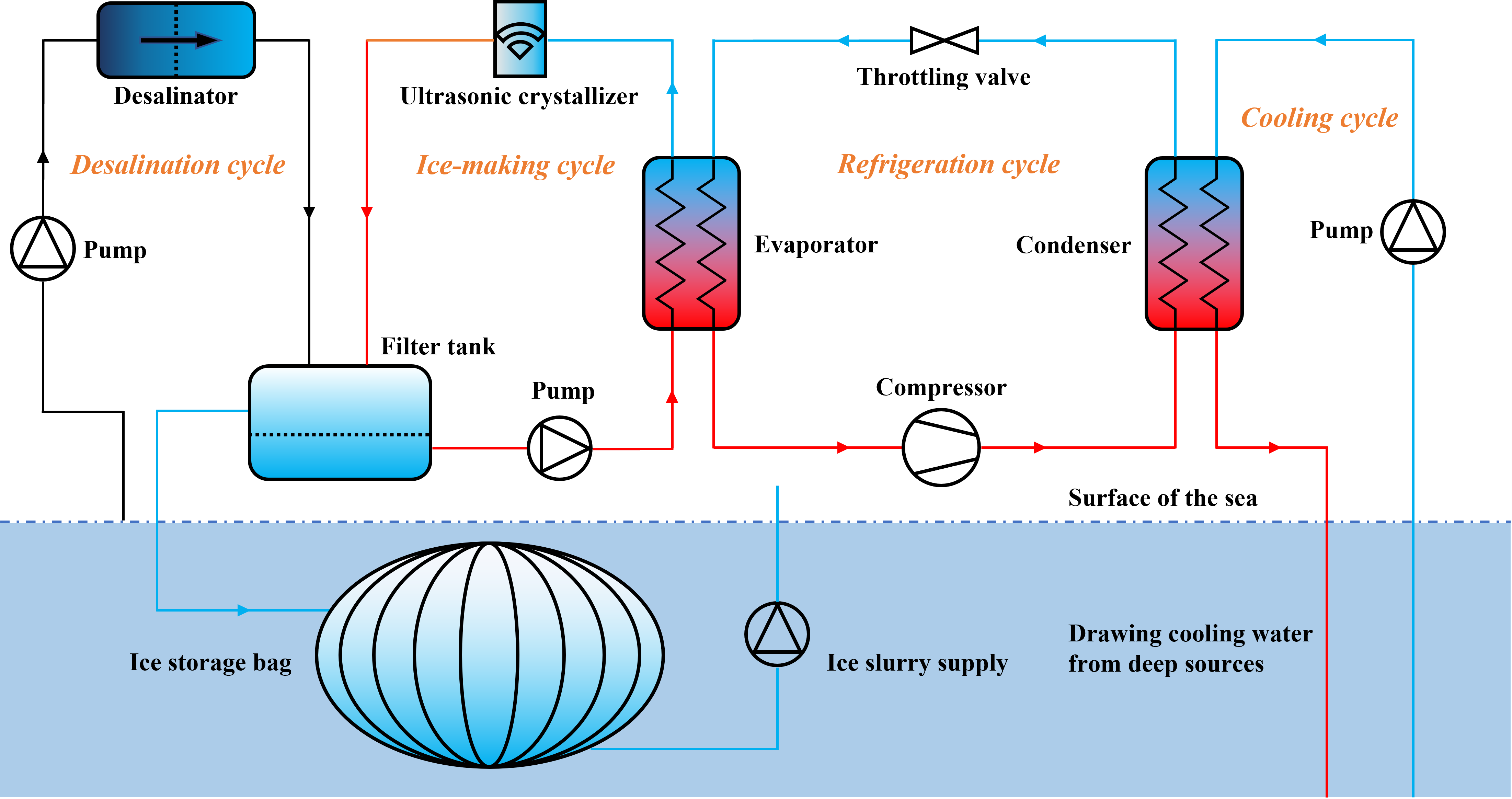 研究团队设计了一套集海水冰浆、电池储能与碳捕集于一体的P2I系统,直接将海上风电与光伏的绿色电能,就地利用海水转化为可泵送、可储存的流态化冰浆,以冷能形式存储在作业平台或水下柔性囊式冰袋中,服务于海上渔业冷链物流。