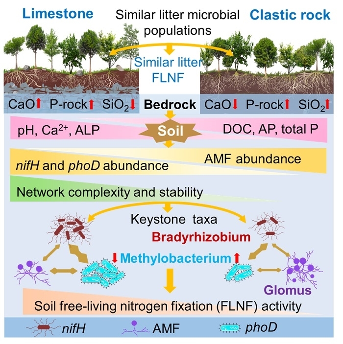 针对这一问题,本研究基于中国西南区域尺度野外采样,通过对比石灰岩与碎屑岩森林生态系统,从岩性差异与温度变化两个角度,系统探讨土壤与凋落物自生固氮速率及其与微生物互作网络的关系;结合温度升高条件,深入解析喀斯特植被恢复促进碳氮积累的微生物调控路径,从而揭示高钙环境下多营养级生物互作在土壤碳氮循环及气候变化应对中的关键作用。