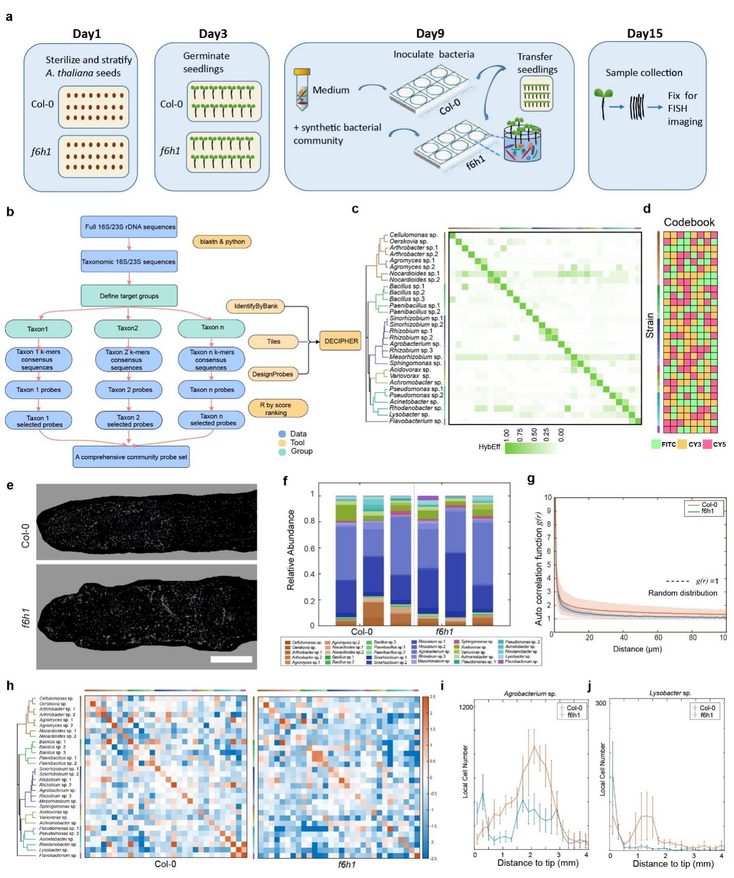 为验证SEER-Map的应用能力,研究团队对由30株菌株组成的合成微生物群落(SynCom30)在拟南芥根系的定殖情况进行了全面的空间解析(图3)。实验比较了两种拟南芥基因型:野生型(Col-0)和香豆素合成缺陷突变体f6'h1。F6'H1基因是拟南芥根系分泌香豆素的关键基因,这类代谢物在促进铁吸收和选择性调控根际微生物组成方面发挥双重作用。实验旨在揭示宿主的化学信号对微生物群落空间结构的精细调控。